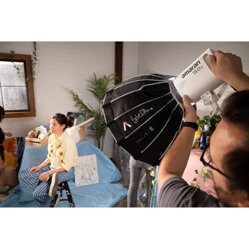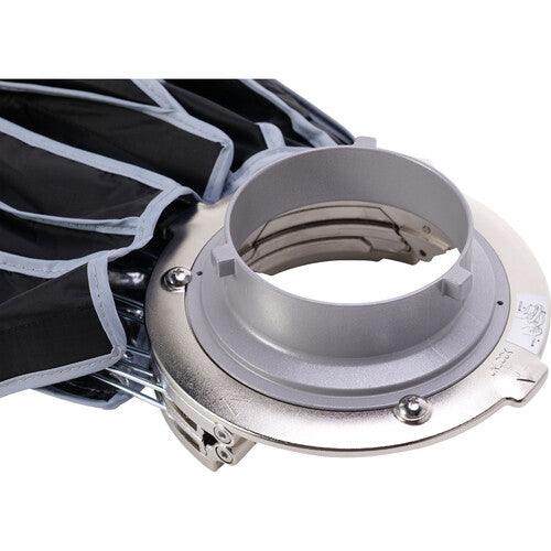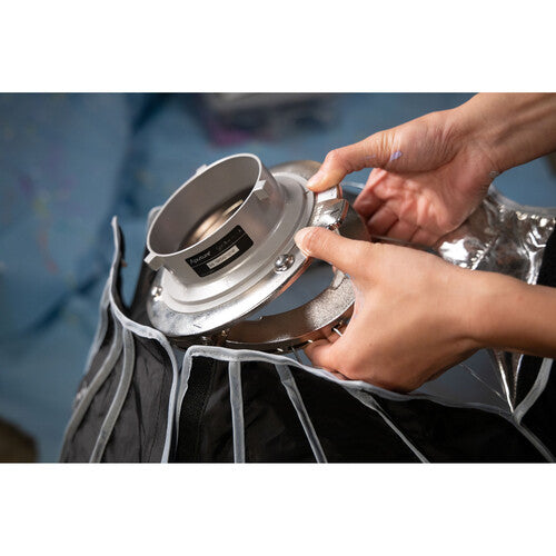 Armed with an upgraded dual-sided and foldable quick release mechanism, the 22.8" Light Dome Mini III from Aputure accelerates the set-up time for its 16-sided, point source-softening circular softbox, bringing professional, portrait-ready light to any shoot in mere seconds. Optimized for lightweight portability, the parabolic, hexadecanol structure of the Light Dome Mini III is fortified by 16 durable steel support rods, which now snap into place with the downward press of its widely compatible Bowens Mount bracket, saving valuable time on set. Its shape also promotes uniform light output distribution for soft, even light on any subject. The modifier features a silver interior to maximize the light source's output and comes with an inner diffuser, 1.5-stop, and 2.5-stop front diffusers, and a 40° fabric grid for further light-shaping capabilities.