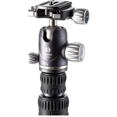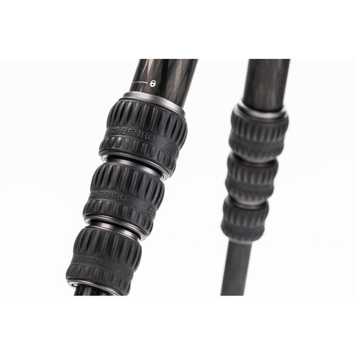 The Bat One Series Carbon Fiber Travel Tripod with VX20 Ball Head from Benro is a compact, lightweight tripod with a high load capacity and remarkable stability. The legs offer independent positioning with 5 available preset leg angles, allowing the legs to be placed in more positions than traditional tripods are capable of. The legs are also reversible for inverted shooting and compact storage and travel. The auto-hold leg position trigger makes adjusting the tripod leg angles quick and easy. The aluminum leg spider features three 1/4"-20 accessory mounts for attaching accessory extension arms, monitors, lights, and more. The rubber feet feature three distinct contact surfaces providing a grip whether the legs are vertical, on an angle, or nearly horizontal when positioned.