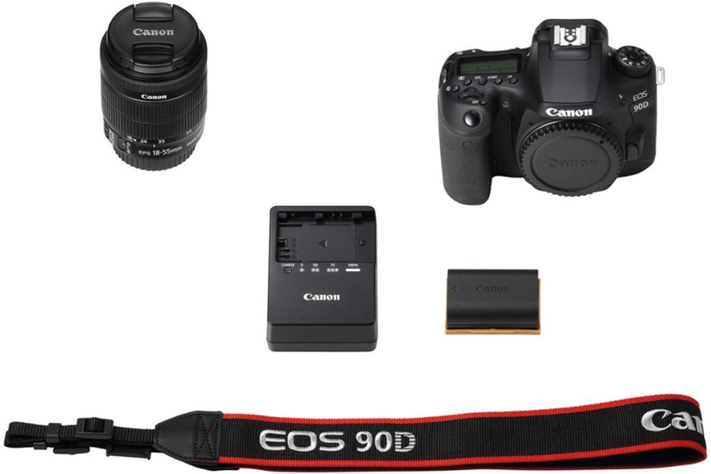 In The Box | EOS 90D Body (Black) EF-S 18-55mm f/3.5-5.6 IS STM Lens Canon Eyecup Eb Canon RF-3 Body Cap for Canon EOS Cameras Battery Pack LP-E6N Battery Charger LC-E6 Neck Strap |
