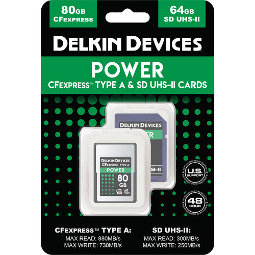 The 80GB POWER CFexpress Type A & 64GB POWER UHS-II SDXC Memory Card Bundle from Delkin Devices combines an 80GB POWER CFexpress Type A memory card with a 64GB POWER UHS-II SDXC memory card.