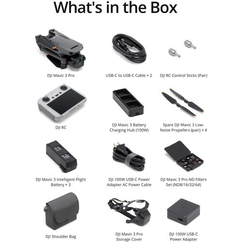 In The Box | DJI Mavic 3 Pro Drone with Fly More Combo & DJI RC, RC Remote, Pair of Control Sticks, 3 x Intelligent Flight Battery, 6 x Pair of Low-Noise Propellers, 100W USB-C Power Adapter, 100W USB-C Power Adapter AC Power Cable, 100W Battery Charging Hub, Storage Cover, ND Filter Set (ND8, ND16, ND32, and ND64), 2 x USB-C Cable, Shoulder Bag, Limited 1-Year Manufacturer Warranty (Excluding Battery and Propellers), Limited 1-Year Manufacturer Warranty (Battery with Less Than 200 Charge Cycles) |
