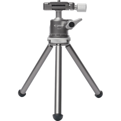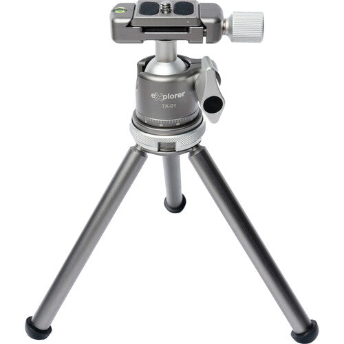The Explorer TX-MK Travel Explorer Mini Table Top Tripod Kit is a lightweight tabletop tripod perfect for stabilizing DSLR cameras, Mirrorless cameras, compact cameras, and other accessories. It’s made of lightweight aircraft-grade aluminum and supports up to 5kg (11lbs) on the included TX-01 Explorer Travel ball head. The single-leg section tripod is height adjustable to two positions by expanding the leg radius and lockable via the collar rotator ring to ensure stability in either position.