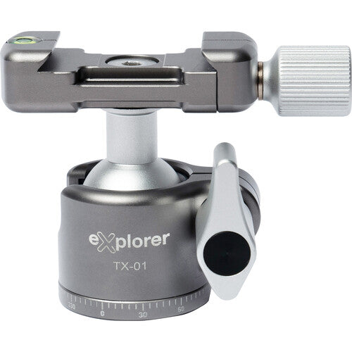 The included TX-01 Travel Explorer Ball-Head is fitted via a 3/8” screw and has a 25mm diameter ball head and Explorer EX-26 ARCA / RSS Compatible base plate. The ball head has a 360° panning base with scale marks to assist with shooting and stitching panoramic images.