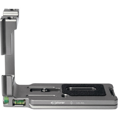 The Explorer VX-R5 Vertical Explore L Bracket for Canon EOS R5 / R6 mirrorless full-frame cameras is a custom-designed L bracket allowing you to quickly change the orientation of your camera from horizontal to vertical mounting positions while maintaining a center of balance through the middle of the tripod. The Explorer VX-R5 is a single-piece CNC machined aluminum alloy bracket with an anodized finish for durability and is lightweight at just 111g (3.9oz). The bracket mounts to the camera via UNC1/4”-20 screw with convex edges, anti-slip plate, and dual safety stops minimizing lateral movement to help prevent the camera from accidentally sliding out of a compatible quick release clamp. The VX-R5 is fully compatible with is compatible with both Arca-type and Really Right Stuff lever clamp.