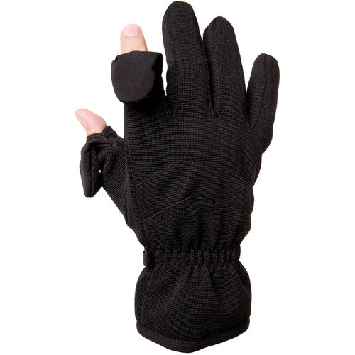 When photographing in cold weather you can open the finger tips so that you can more easily access small buttons on your camera, which might be difficult to access if you were wearing normal gloves. When you need to access buttons on your camera, simply pull back the thumb and forefinger tips of the gloves to reveal your fingers. The tips are secured in place by magnets until you are ready to cover your fingers again. The palm patch features a silicon grip to prevent your camera from slipping. The gloves are designed to fit snugly so you can hold and operate your camera easily. For a looser fit, order the next size up.