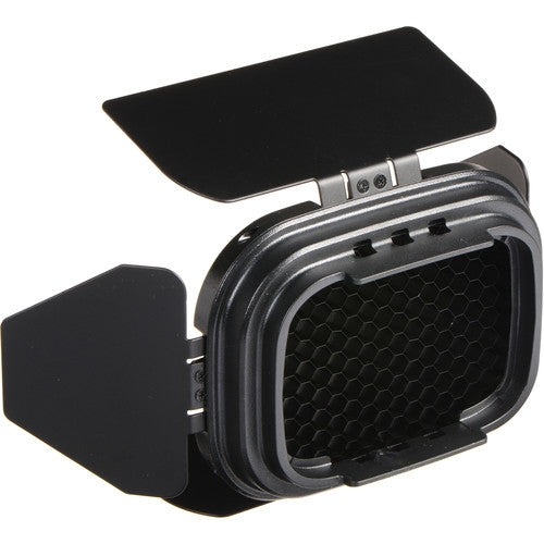 The Barndoor Kit with 4 Color Gels for the AD200 Speedlight from Godox attaches directly to the front of the flash. Each leaf on the 4-leaf barndoor moves independently to maintain and control the direction of the light. A 4-color gel set is also included, which consists of red, blue, yellow, and green colors. These gels help create dramatic lighting effects in your images.