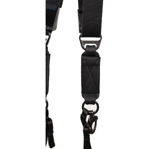 The black MoneyMaker Two-Camera Swag Harness by HoldFast Gear is made of non-leather cotton canvas, and holds two cameras comfortably at your hips. The straps of the harness lie in an "X" pattern across your back for added support. The Speed Clutch mechanism allows the camera to slide along the harness to eye level easily.