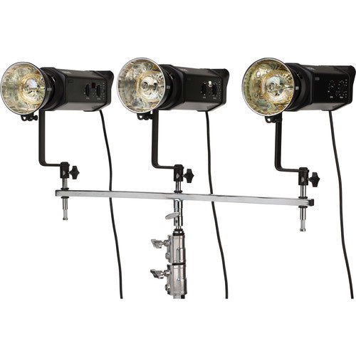 This Baby Triple Header from Kupo The handy adapter allows up to five light fixtures or accessories onto a single light stand. Features five baby studs with embossed necks welded onto sturdy steel and offset for mounting up to five lights. This triple header can be mounted on the stand top of a 16mm baby stud or fit into a 28mm junior receiver and tightenes securely with a robust metal knob.
