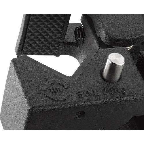The Convi Clamp With Adjustable Handle from Kupo has a hexagonal receiver that accepts many Convi accessories to mount almost any light fixture, camera or accessory. This clamp has a ratcheted handle that allows you to reposition it in case you don't have clearance to rotate the handle in a complete circle to tighten or loosen it. The clamp features a lightweight alloy construction with stainless steel bolts, and has a stealthy black finish.