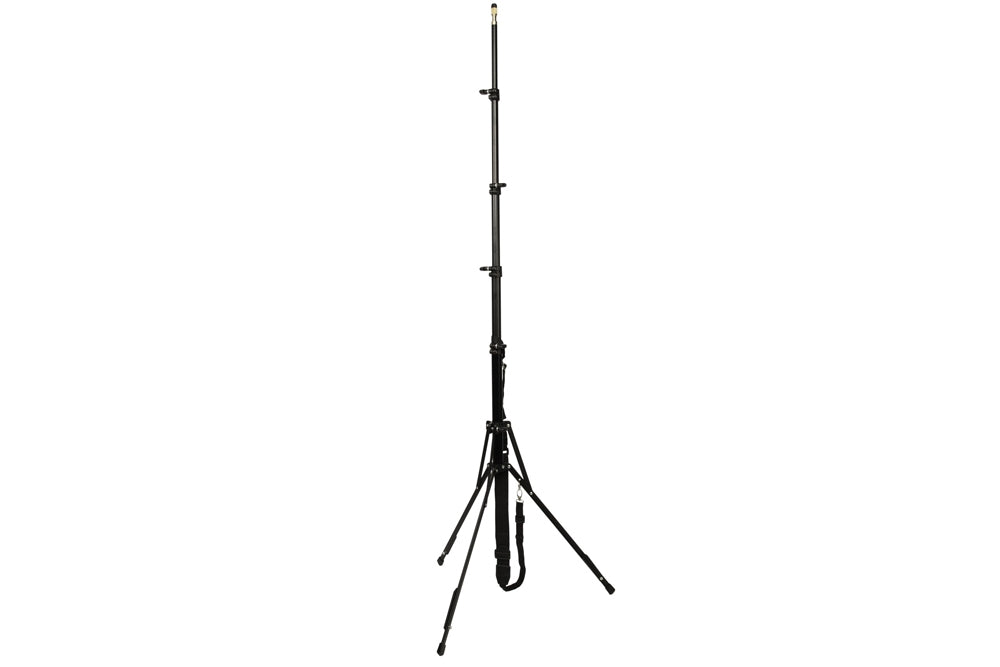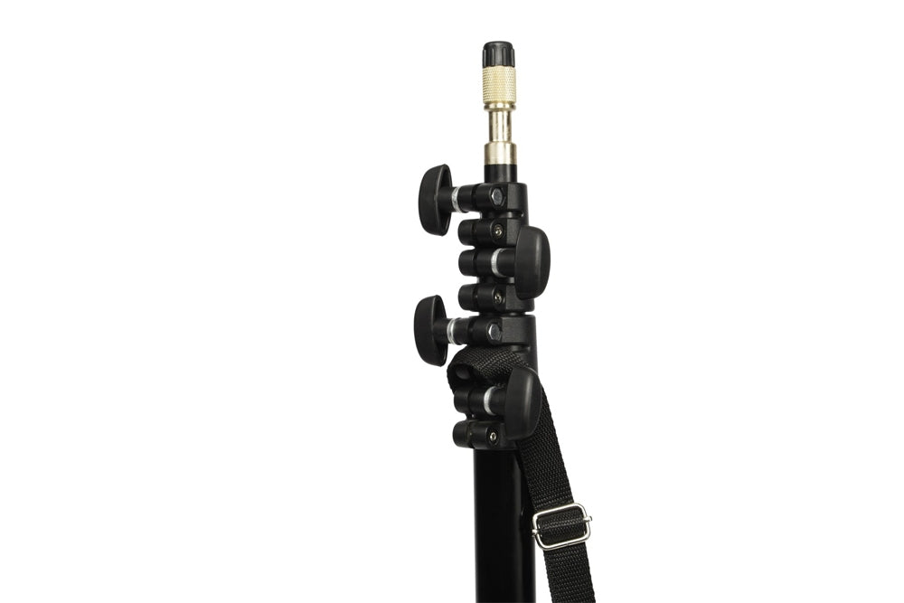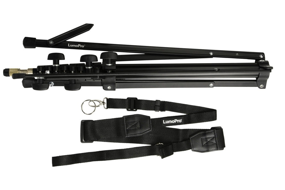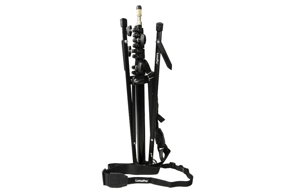 The stand is made of aluminum with metal locking collars, 5 sections and 4 risers. Retractable legs fold tight to the center column to make the LP605S one of the most compact stands of its class. The LP605S is the ideal support for lightweight lighting kits, on location or in the studio. Similar to other LumoPro light stands, built-in ground spikes can be used to secure the stand on semi-soft surfaces. Drive the spikes into the ground on location to help keep your stand from falling over. If the spikes or strap don't appeal to you, these are easily removable!