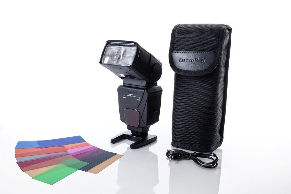 In The Box | 1- LP180 Quad-Sync Manual Flash 1- 3.5mm Miniphone to 3.5mm Miniphone (Short) Sync Cord 1- LP180 Softcase 1- Set of Rosco Color Correction Gels (cut specially for the LP180) 1- Set of Rosco Color Effects Gels (cut specially for the LP180) 1- Small Flash Foot Stand 1- Instruction Manual |