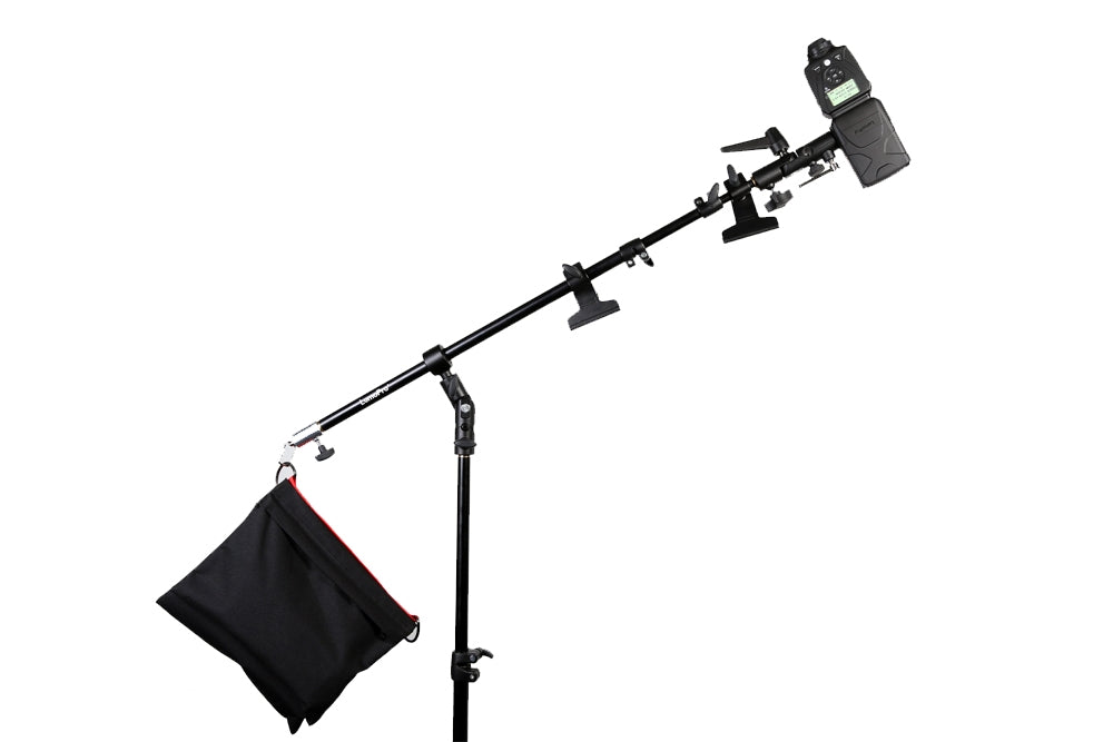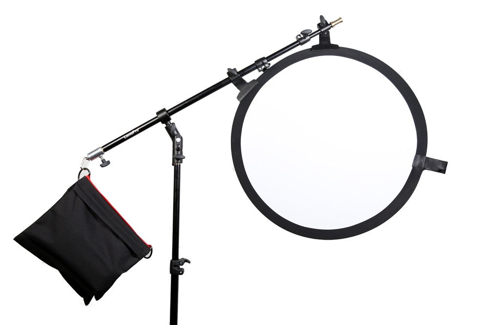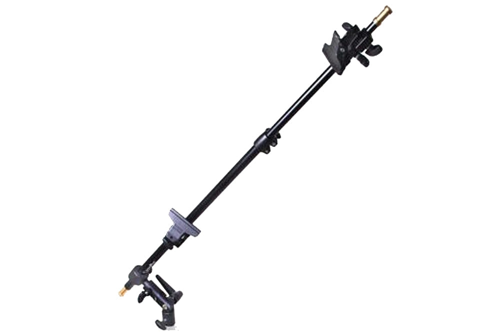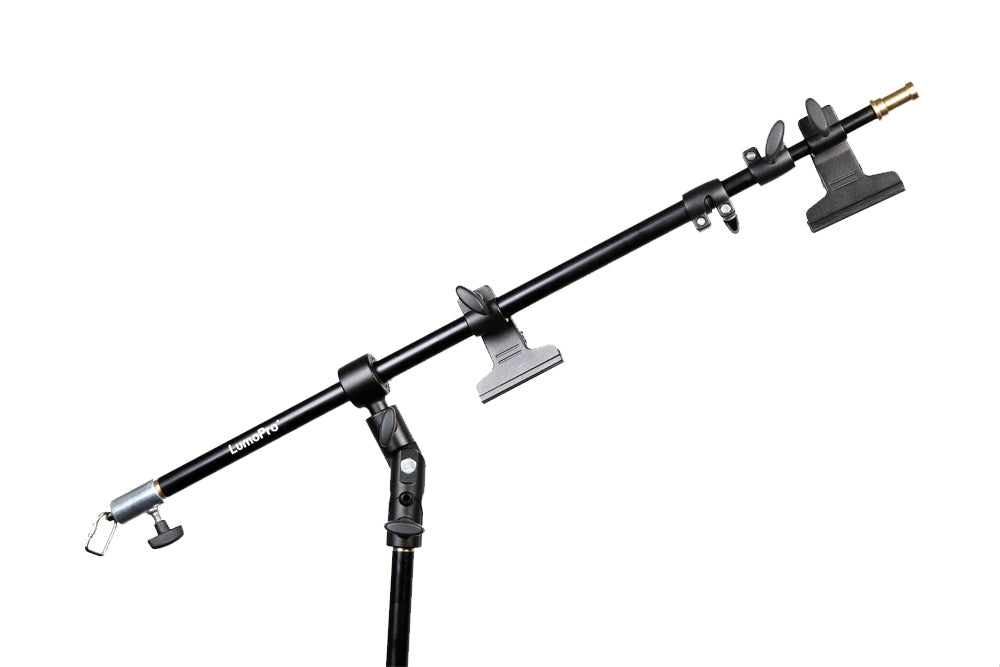 The LP621 Mini Boom / Reflector Arm extends the reach of your lighting and is perfect for holding a reflector or a shoe mount flash and small accessory. The boom arm features a double telescopic extension for a maximum width of 5.5 feet, an articulating swivel head with a ratcheting adjustment lever and includes an attachment to add on a counterweight or sandbag. The attached swivel allows the mini boom to be mounted on any standard light stand. The included clips easily support a reflector or other accessories and are adjustable for maximum control over positioning. Both ends of the boom arm feature a standard 5/8" stud.