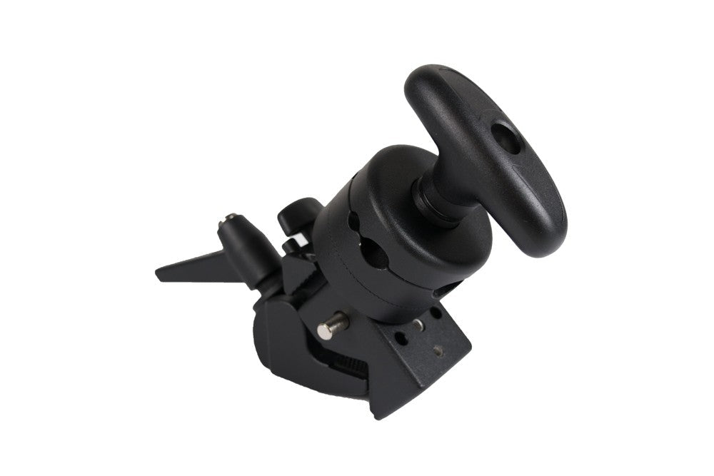 The LP628 Studio Clamp with Griphead is a combo that can be used to mount a boom arm to virtually any surface. The LP628's multi-purpose clamp will mount any standard male or female 5/8", female 1/4"-20 or female 3/8" threaded accessories. Alone the clamp is made to mount on round surfaces (like tree branches or pipes), and the provided plastic wedge allows attachment to square surfaces (like doors or table surfaces) as well. The LP628's griphead will support a boom arm to mount various accessories. Get your boom arm off the light stand, and mount it anywhere with this versatile piece of grip gear. The griphead is compatible with most standard boom arms.
