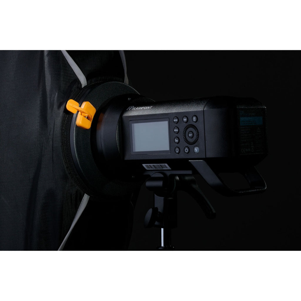 Installation of the flash takes only a few seconds. Open the two doors of this MagRing, magnetically attach your flash unit(s), and shut the doors. Your softbox can then be mounted on the front, also magnetically. All MagBox Pro softboxes are compatible.