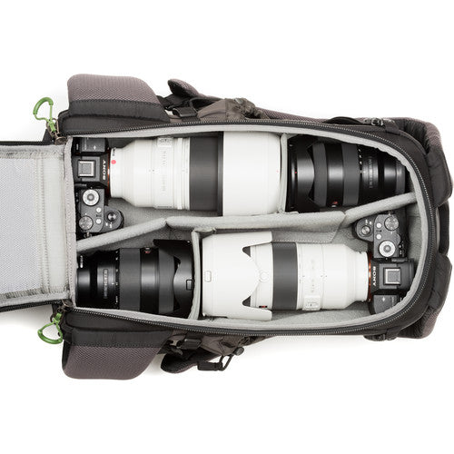 - Adjustable dividers for large telephoto lenses, traditional photo gear, or personal items