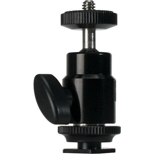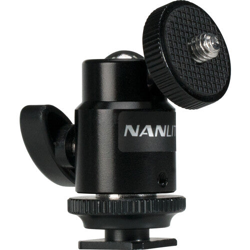 The Nanlite Mini Ball Head with Hot Shoe Adapter securely slides into your camera's hot shoe and also offers a female 1/4"-20 receiver for stand mounting. At the top is a single action locking ball head with a 1/4"-20 male thread that is compatible with a variety of accessories.