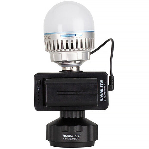 The separately available Nanlite NP-F Battery Adapter and Mount for PavoBulb 10C can be used to operate the bulb on battery power, while using the E27 Magnetic Mount for placement.