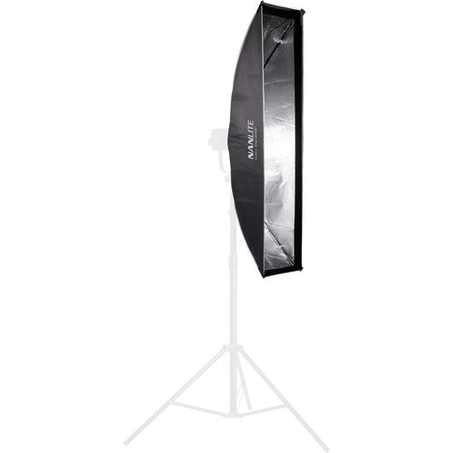 Dramatically soften the light from your strobe or light source with this 12 x 55" Stripbank Softbox from Nanlite. Compatible with lights utilizing a Bowens-mount speed ring, this modifier features a strip shape that is thinner than standard softboxes. This creates a narrow light output with limited spill that is well-suited for accent, hair, and rim lighting, as well as rendering long, elegant highlights on glassware and reflective objects. The Stripbox has a removable front panel and a silver interior for maximum output.