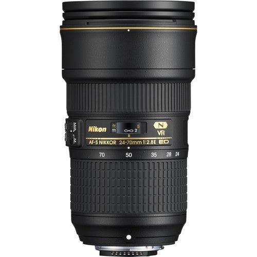 The classic standard zoom now featuring Vibration Reduction image stabilization, Nikon's AF-S NIKKOR 24-70mm f/2.8E ED VR Lens is a truly versatile wide-angle to short telephoto lens characterized by its constant f/2.8 maximum aperture and electromagnetic aperture mechanism. A revised optical design incorporates a unique aspherical extra-low dispersion element, in addition to three aspherical, two extra-low dispersion, and one high refractive index elements, to help reduce chromatic aberrations and distortions throughout the zoom range in order to achieve high image sharpness and clarity. The Nano Crystal and Super Integrated Coatings further benefit image quality by reducing lens flare for improved contrast and color accuracy and fluorine coatings on the front and rear elements protect against dust, moisture, and smudging.
