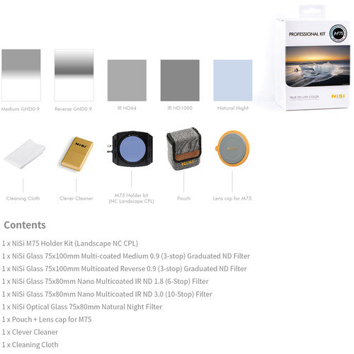 In The Box | NiSi 75mm Professional Kit with M75 Filter Holder, Enhanced Landscape CPL & 5 ND/GND Filters NiSi M75 Filter Holder Kit NiSi 75 x 80mm Nano IRND 1.8 Filter (6-Stop) NiSi 75 x 80mm Nano IRND 3.0 Filter (10-Stop) NiSi 75 x 100mm Nano Medium-Edge Graduated IRND 0.9 Filter (3-Stop) NiSi 75 x 100mm Nano Hard-Edge Reverse-Graduated IRND 0.9 to 0.15 Filter (3 to 0.5-Stop) NiSi 75 x 80mm Natural-Night Filter NiSi Clever Cleaner Filter Brush Cleaning Cloth NiSi M75 Protection Lens Cap Limited 1-Year Warranty |