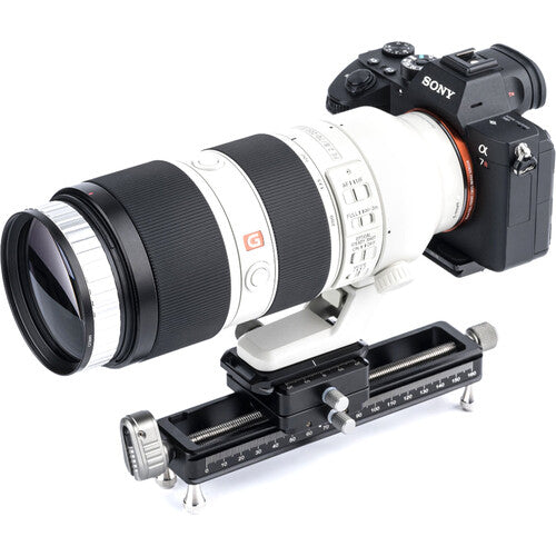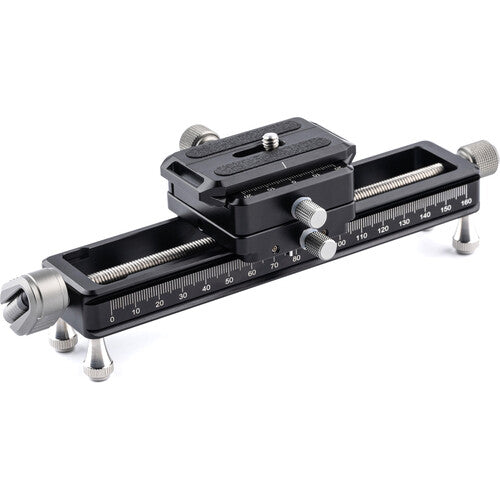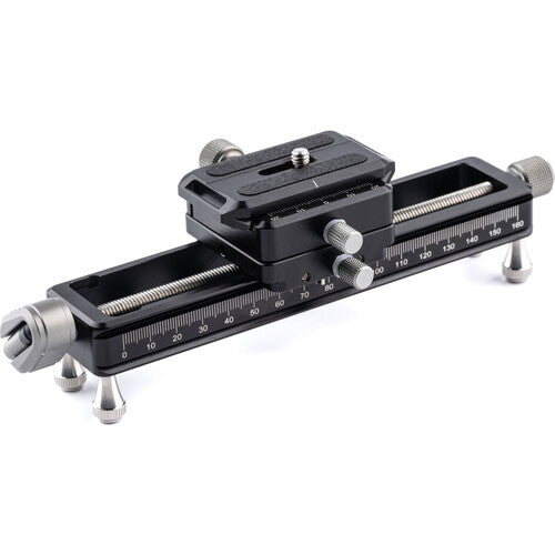 The compact Macro Focusing Rail NM-180 from Nisi provides precision camera-to-subject distance control for macro photography using still- and video camera and lens combinations up to 11 pounds. The integrated Arca-type quick release set rotates a full 360° for full control of camera placement and securely locks with a knob. An Arca-type dovetail runs the length of the chassis, allowing it to be clamped directly to most Arca-type tripod quick release receivers. The dovetail also allows one NM-180 rail to be stacked on another for dual-axis movement. The rail comes complete with four rubber-tipped feet for tabletop use.