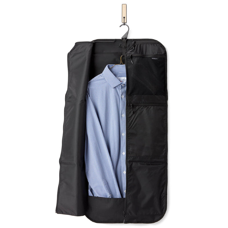 An integrated loop at the top lets you use your own hangers for better organization and easier unpacking when you get to your destination. When your clothes are packed, the bag zippers shut to protect them from dust, dirt, and water, and there are pockets of various sizes to hold accessories like ties, pocket squares, small toiletries, and other personal items. An added design feature is a folding hook, so you can hang the entire bag from a coat hook for easy access.