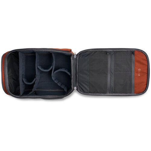 The Rust, 18L LUMA Camera Pack from Nomatic is a collaboration between Nomatic and Peter McKinnon that features a sleek and compact design ideal for your compact mirrorless camera kit. It has a designated sleeve for your 16" laptop and dividers to customize the interior for maximum protection of your gear. Two zippered pockets on the lid interior hold and organize small accessories. The exterior has an integrated tuck-away boot for carrying a tripod and the side pocket holds a water bottle. An external attachment system with eight integrated loops is handy for carrying extra accessories. Attach the pack to the handle of your rolling bag using the luggage passthrough for seamless travel.