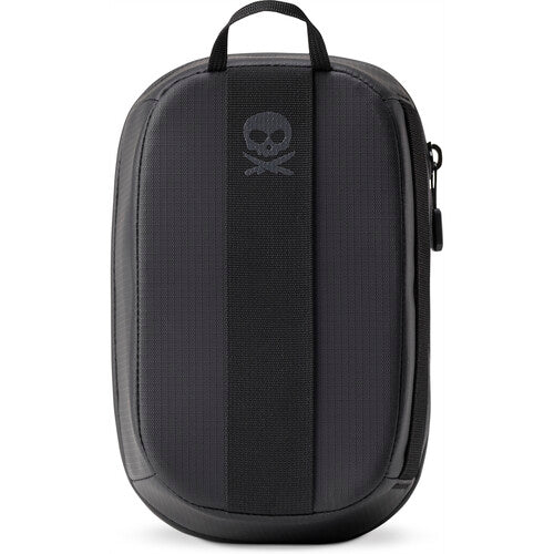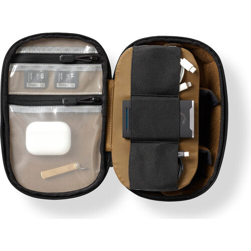The McKinnon Camera Tech Organizer from Nomatic is designed to hold and organize a compact camera plus accessories such as memory cards, cables, card readers, adapters, and other small gear. It is made from water-resistant and durable materials and zippers. The interior has four main compartments with customizable dividers separating each one. On the interior side of the top closure, there are two transparent pockets. The center flap features three elastic loops for securing cables and other small items. On the exterior, there is a carrying strap and a hanging loop.