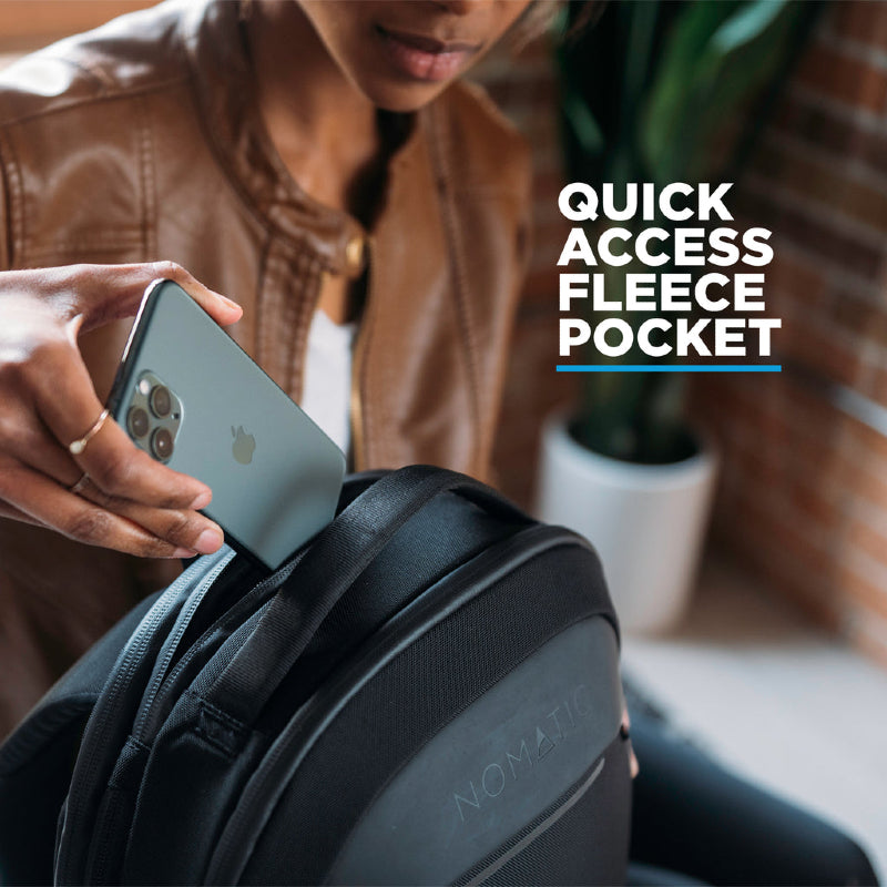 - A quick-access, fleece-lined pocket rests on the outside of the bag, allowing you to grab important items without rummaging through your bag