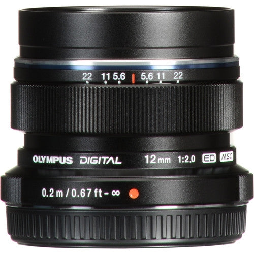 A compact wide-angle prime with intuitive handling and an advanced optical design, the black M.Zuiko Digital ED 12mm f/2 from Olympus is a 24mm equivalent lens for Micro Four Thirds mirrorless cameras. The wide focal length pairs with the bright f/2 maximum aperture to benefit available light shooting as well as astrophotography applications. The lens's optical design makes use of one aspherical element, one DSA (Double Super Aspherical) element, and a Super HR (high refractive index) element to reduce spherical aberrations and control distortion for notable sharpness, and one extra-low dispersion element reduces color fringing for high clarity and color accuracy. Additionally, the lens is characterized by its Movie & Still Compatible autofocus system for quick and quiet performance, as well as a manual focus clutch and Snapshot Focus mode for intuitive control over focus position and depth of field.