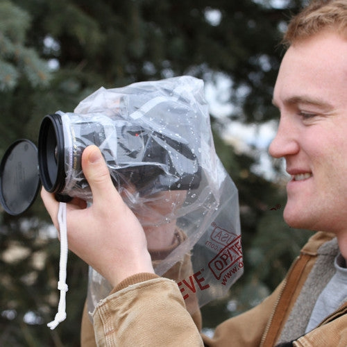 Help protect your camera and lens from foul weather with the 8" Small Rain Sleeve from OP/TECH USA. This see-through plastic rainsleeve is designed to protect your camera and lens up to 8" in length and 4.5" in diameter. Fully-featured, the sleeve protects your gear from dust and inclement weather and may be used handheld or with a tripod. For added protection, the rainsleeve may be used with a lens hood, and has a drawstring closure. Photographers will appreciate that the rainsleeve is customizable to the camera's eyepiece. This package contains two rain sleeves.