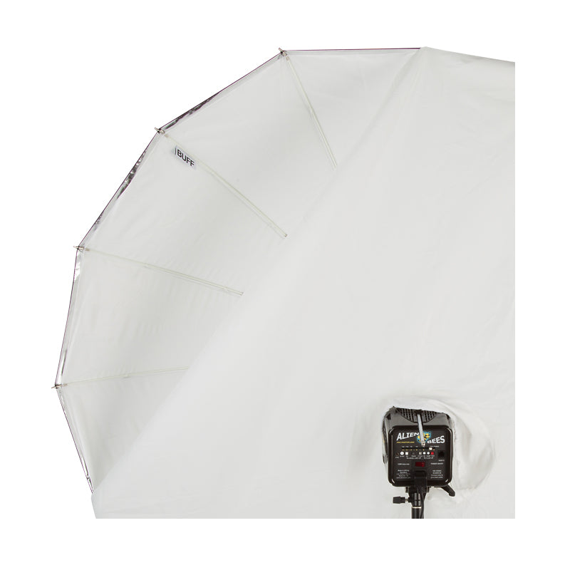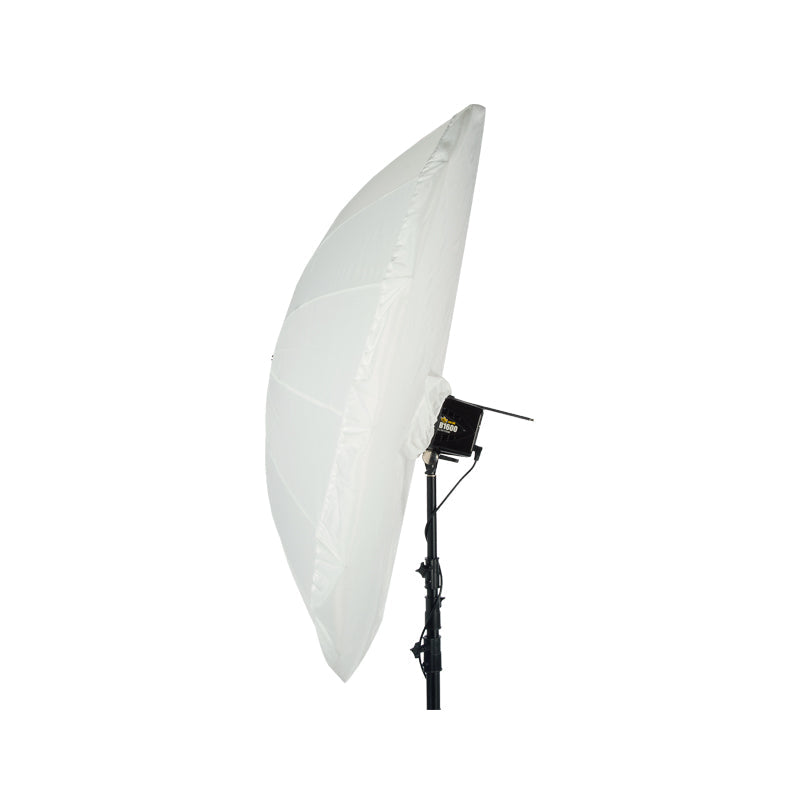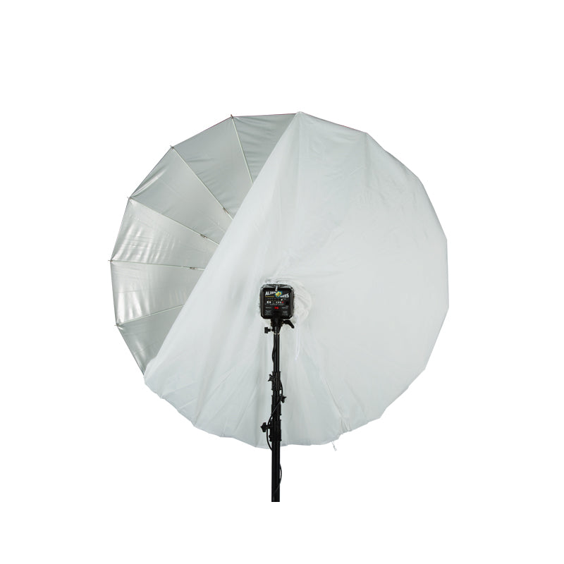 The White Front Diffusion Fabric is available in 51”, 64”, and 86” for the corresponding size PLM™ umbrellas - for use with both the Soft Silver PLM™ and White PLM™ umbrellas. When used with the Soft Silver PLM™, the beam spread is widened and it becomes a superior bounced-light octabox with very even light across the surface. When used with the White PLM™, it produces a very soft, wide-angle bounced light source. The white fabric fits over the face of the open umbrella and has a center hole opening for the flash unit (with a drawstring to tighten around the face of the flash unit).