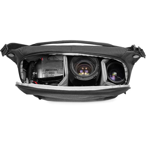 Perfect for hauling essentials, the Everyday Sling from Peak Design has a lightweight and minimalist design with plenty of room for your gear. The main dual-zippered compartment holds photo gear or your everyday items. The interior is a high-visibility gray, so it's easier to find what you need in low-light environments. Zip it closed for security or click the magnetic closure for privacy and quick access. The eco-friendly bag is made from 100% recycled material. The 400D double poly-coated, DWR-impregnated, nylon canvas exterior is durable and weather resistant. Use the included padded shoulder strap to wear it over your shoulder or cross-body style. The two short Cord Hook straps attach bulky gear to the exterior of the bag.