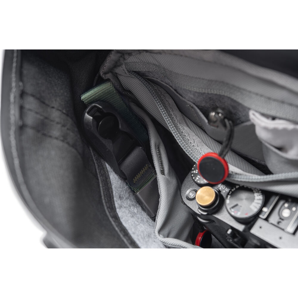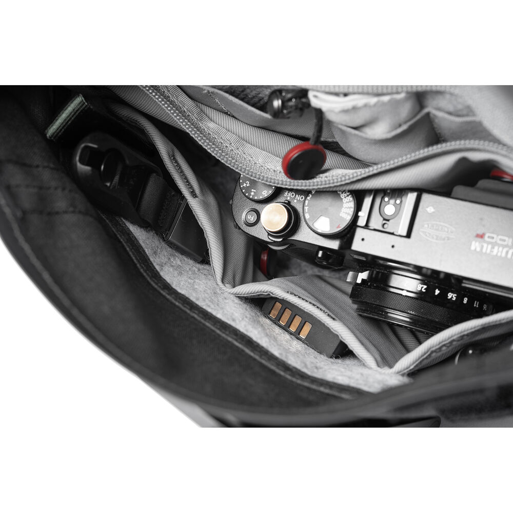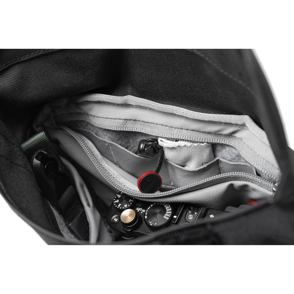 Updated with sleeker lines, improved pocket layout, and a stowable strap, the Peak Design Field Pouch v2, in black, lets you store your small camera, lenses, accessories, or cables in style. Organize more of your gear by utilizing the one zippered and eight slip interior pockets and take advantage of the two attachment points for Peak Design's Capture. Its roll-top design allows you to over-stuff it to double it's regular size and still close the top to keep your stuff safe. Keep your pouch in a bigger bag, use the integrated loops to wear it on your belt, or use the adjustable strap to wear the pouch sling-style or around your waist. The pouch is made of Bluesign-approved recycled materials including its 400D nylon canvas shell and felt liner. The shell is also coated with two layers of polyurethane waterproofing for maximum gear protection.