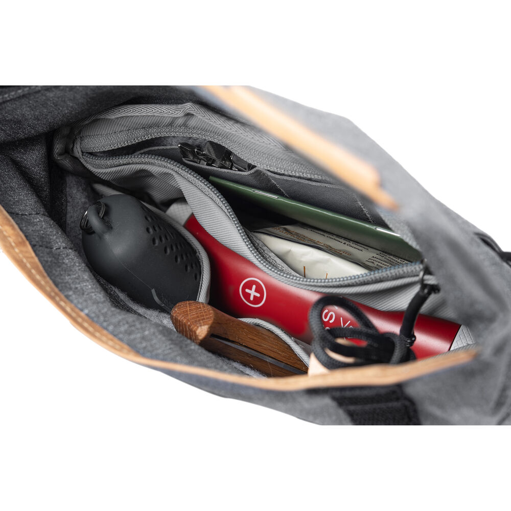 Updated with sleeker lines, improved pocket layout, and a stowable strap, the Peak Design Field Pouch v2, in charcoal, lets you store your small camera, lenses, accessories, or cables in style. Organize more of your gear by utilizing the one zippered and eight slip interior pockets and take advantage of the two attachment points for Peak Design's Capture. Its roll-top design allows you to over-stuff it to double it's regular size and still close the top to keep your stuff safe. Keep your pouch in a bigger bag, use the integrated loops to wear it on your belt, or use the adjustable strap to wear the pouch sling-style or around your waist. The pouch is made of Bluesign-approved recycled materials including its 400D nylon canvas shell and felt liner. The shell is also coated with two layers of polyurethane waterproofing for maximum gear protection.
