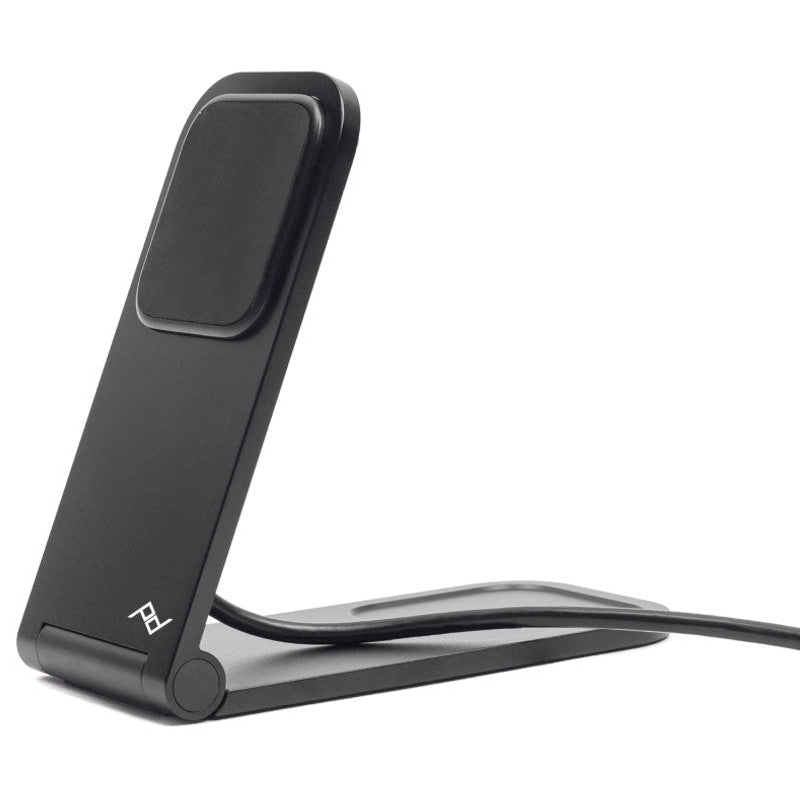 Part desktop sculpture, part charging phone stand, our Wireless Charging Stand is made out of precision-machined anodized aluminum and adjusts with an ultra-smooth friction hinge to find your optimal viewing angle. Magnetically grabs your phone with a satisfying 'pop' and holds it in portrait or landscape mode. The magnets, charging components, and chassis are each custom-designed to optimize charging alignment, charging speed, and heat dissipation. This unique mounting system is called SlimLink™‚ and it's so fast and secure, it borders on magic. A grippy silicone base and solid aluminum build allows for 1-handed phone removal‚ the stand stays put, unlike with other magnetic chargers. Hinged construction lets you infinitely adjust viewing angle, and also fold the stand flat for easy transport. Elegant, functional, and beautiful, it's the charging stand that your desk or bedside table deserves.