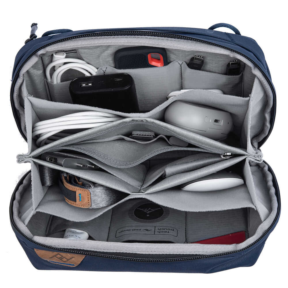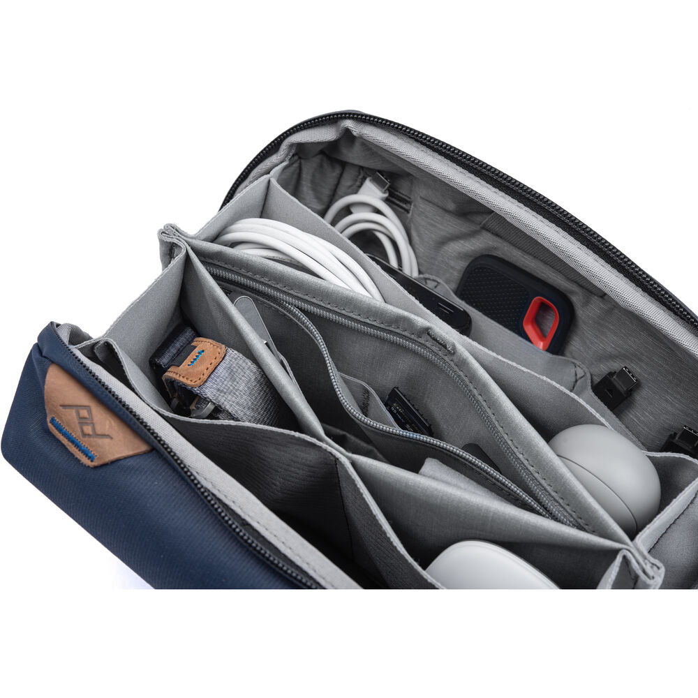 The Peak Design Travel Tech 2L Pouch, in midnight blue, is part of a compartment system that enhances your ability to organize the contents of a Peak Design Travel-Series bag. Specifically designed for electronics accessories, it features a water-resistant zipper and a clamshell configuration with fifteen internal organizational pockets to hold a range of devices such as batteries, memory cards, portable hard drives, cables, and power adapters. Internal and external zippered pockets along the length of the pouch give you additional storage for your passport, a smartphone, folded documents, or pens. If you have a power bank to keep your gear charged, there is a power cord pass-through leading from the interior and through the external zippered pocket so you can access it without having to remove it from the pouch.