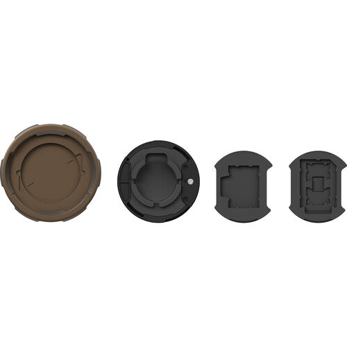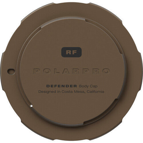 The desert Defender Body Cap for Canon RF Mount from PolarPro is made from 6061 aluminum and thoroughly protects your camera body and sensor from damage. This lens cap has a hidden front tab which can house an SD or CF Express A card or an AirTag. Simply select the storage insert you need for which item you want to carry in the front tab.