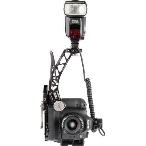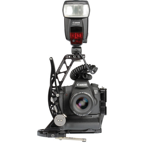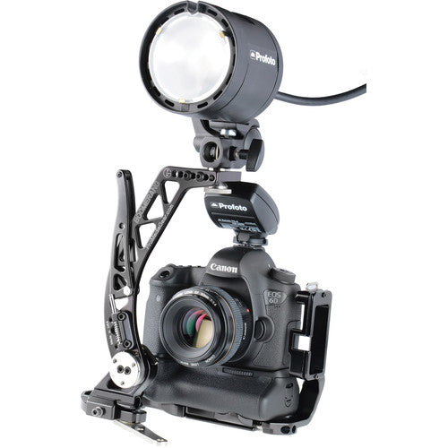 Attaching via an Arca-type compatible universal quick release plate, the bracket provides extra clearance between the camera and bracket while maintaining full access to the camera’s battery compartment. A user-supplied flash cord is required for operation.