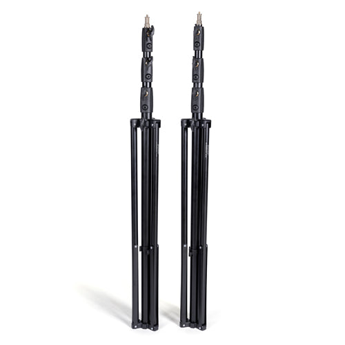 A matte black finish helps avoid unwanted glare and highlights during a shoot. Each stand is topped with a standard 5/8” stud with ¼”-20 threaded post. They achieve a 12’ working height but collapse down to just over 3.5’. A durable fabric case with dedicated sleeves for each stand and the crossbar sections rolls up for easy transport and compact storage.