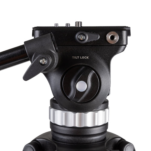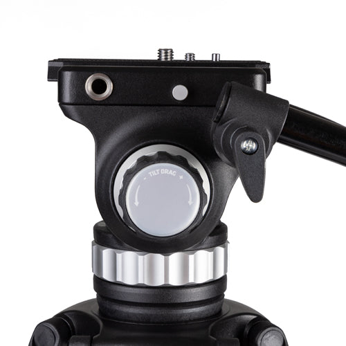 The head features independent pan and tilt locks as well as independent drag, so you can isolate and control movement. Two handles are provided for your convenience. You can use your right or left hand to move the camera while the other is free to operate its controls. Two threaded ports are located on the head as a convenient place to connect accessories. Because these ports are on the head, the accessories will move with your camera and remain pointed at your subject, which is particularly important for lights and microphones.