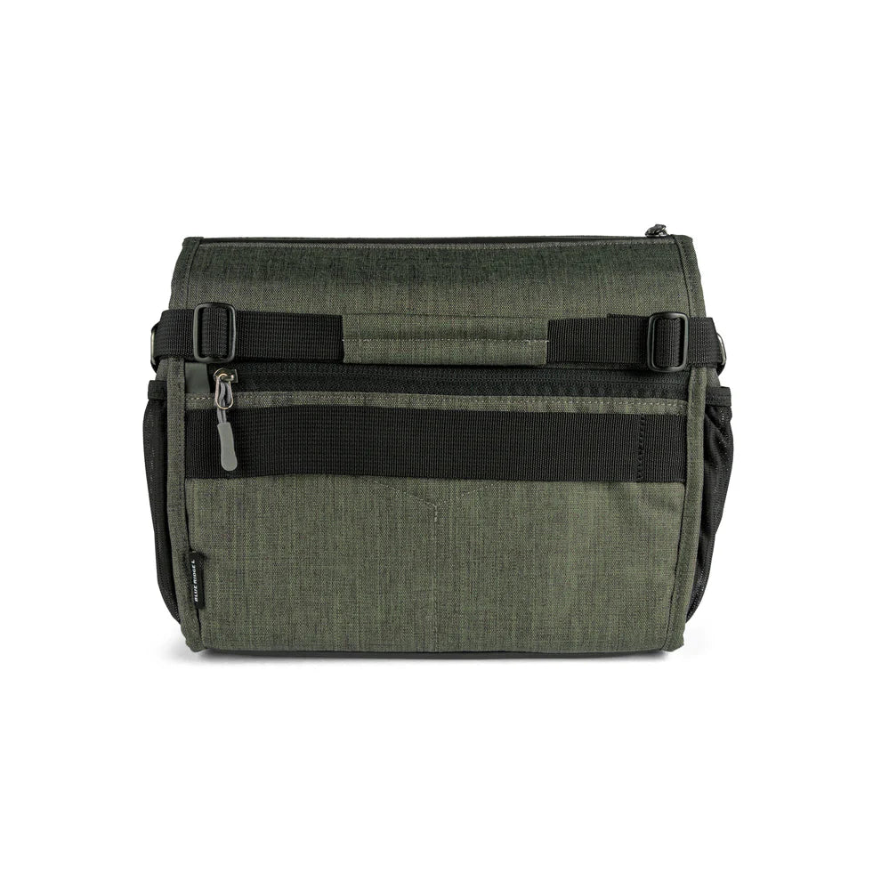 A beautiful, mottled green color, over-the-shoulder camera bag with lots of storage space for its size, and a nifty magnetic latch. This large size bag can hold a mirrorless camera or DSLR with 1 to 4 lenses, speedlight, and accessories.