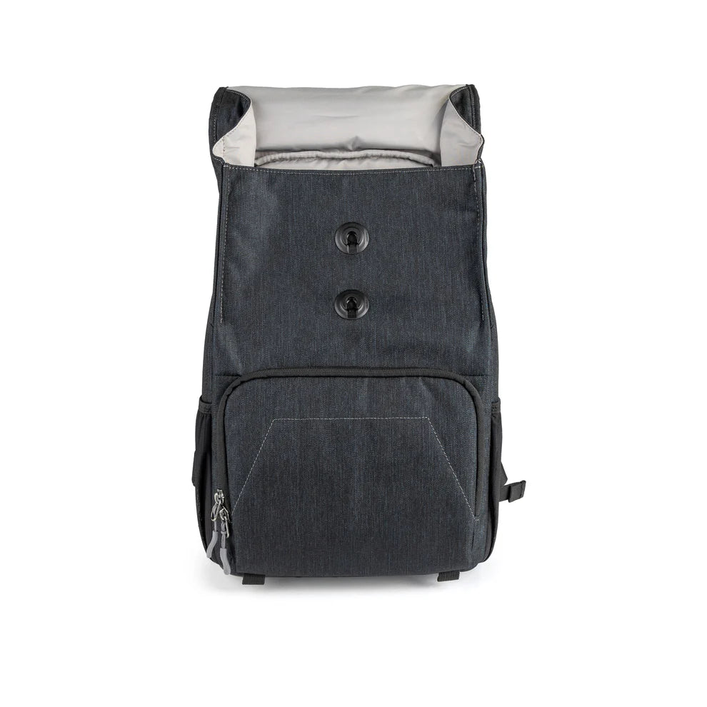 The main camera compartment is positioned against your back for added security and is accessed via a robust rear zipper. Inside, padded, movable dividers let you customize the space for a camera body, multiple lenses, a small light, and accessories. The upper compartment offers room for daily essentials—whether it’s a jacket, lunch, or more camera gear. A vertical laptop sleeve is also accessible from the top compartment, secured internally by a discreet magnetic closure. Externally, a two-stage Fidlock® latch gives you the option to adjust the top flap based on how full the bag is.