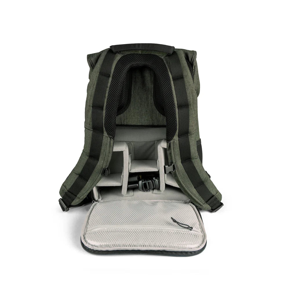 A stylish and functional daypack in a refined mottled green finish, this backpack offers impressive storage for your camera gear, laptop, and daily essentials. Designed with convenience and versatility in mind, it features a dedicated 5.3L padded camera compartment that fits a camera with multiple lenses, a compact light, and accessories. An additional 5L upper compartment provides space for personal items, making it a reliable companion for photography outings, commutes, or travel.