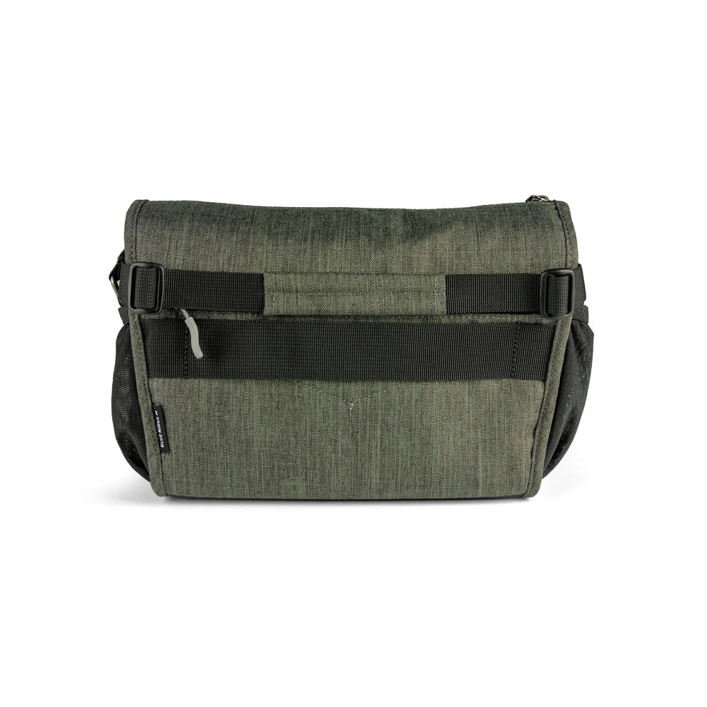 A stylish over-the-shoulder camera bag in an elegant mottled green finish, offering generous storage in a medium-sized profile. Perfectly suited for carrying a mirrorless or DSLR camera with 1 to 3 lenses, a speedlight, and essential accessories.