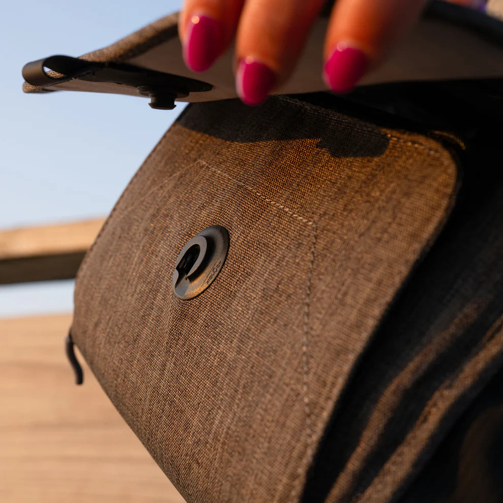 The front flap is secured with a quick-access magnetic Fidlock® latch—just pull downward to release it, and it automatically snaps back into place when closed. For fast top-down access, the main compartment can also be reached via a convenient zipper on top.