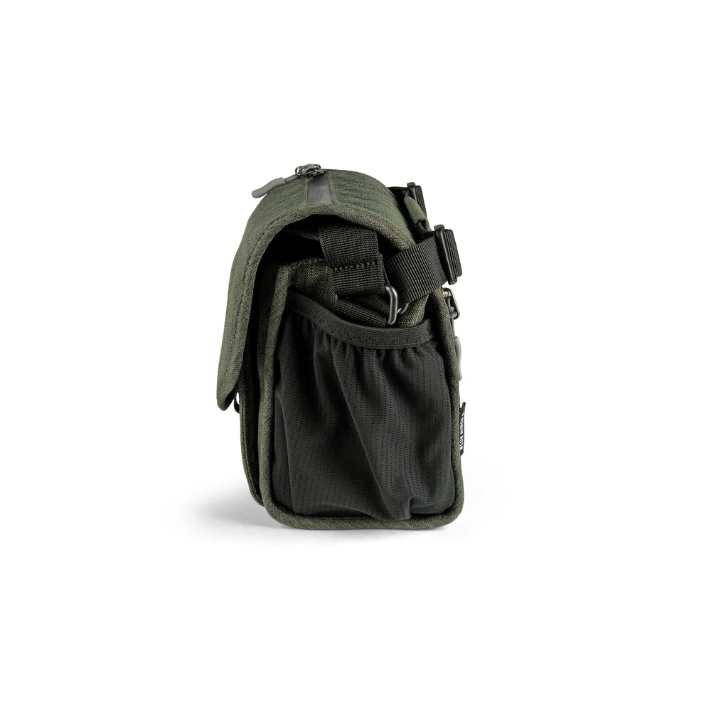 A stunning over-the-shoulder camera bag in a refined mottled green finish, offering impressive storage capacity in a compact form. Designed in a small size, it comfortably fits a small mirrorless or DSLR camera with one or two lenses, a speedlight, and various accessories.