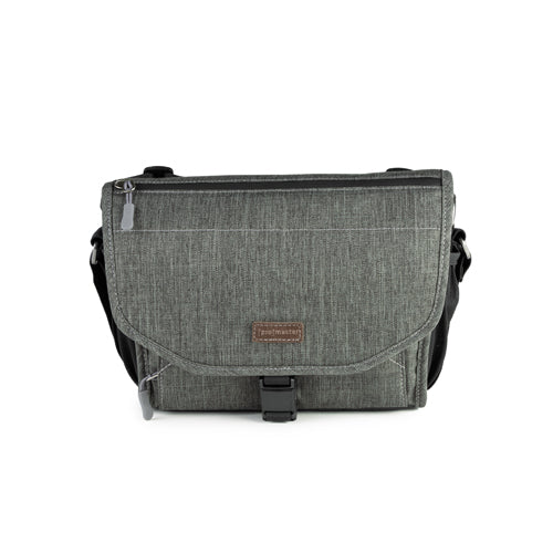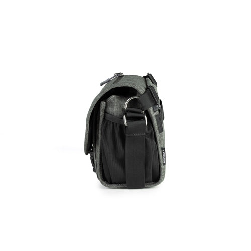 A beautiful, mottled green color, over-the-shoulder camera bag with lots of storage space for its size, and a nifty magnetic latch. This extra small size bag can hold a point-n-shoot or small mirrorless camera with 1 or 2 small lenses and accessories.
