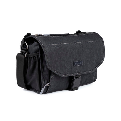 A beautiful, deep blue, over-the-shoulder camera bag with lots of storage space for its size, and a nifty magnetic latch. This large size bag can hold a mirrorless camera or DSLR with 1 to 4 lenses, speedlight, and accessories.