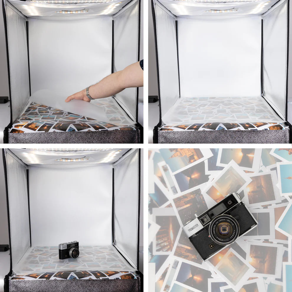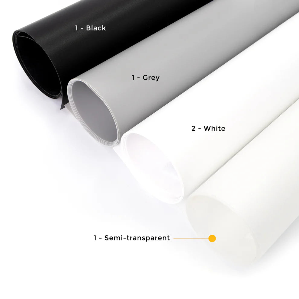 The studio includes four cleanable vinyl background sweeps: white, black, light gray, and a brand-new transparent sweep. Layer the transparent sweep over the others and experiment with materials like colored paper, prints, fabric, or posters—allowing you to create unique textures and backdrops. The result? Endless creative possibilities for building distinctive, professional-quality still life scenes.
